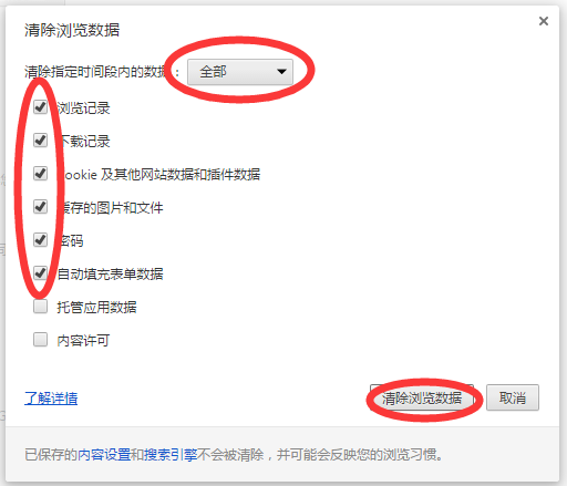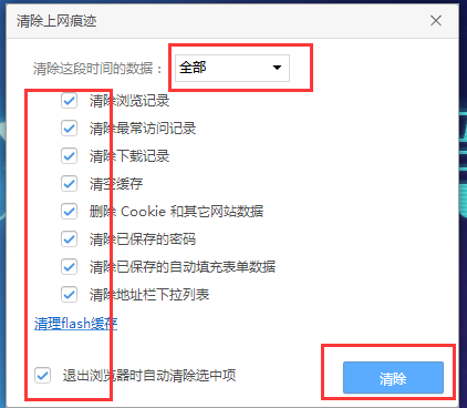 2.6.2 在"清除这段时间的数据"里选择"全部",选项都选上,单击“清除”按钮即可。